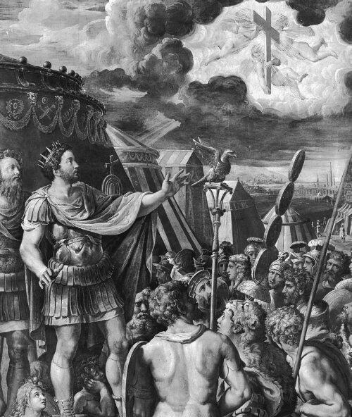 Рис. 1.35. «Видение императора Константина». В небе явился Огненный Крест. Фрагмент фрески из Ватиканского дворца. Станцы. Рим. Рафаэль Санти и его мастерская. Якобы XVI век. Взято из [42], вклейка 52.