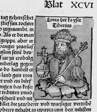 Рис. 1.15. Старинное изображение Тиберия. Хроника X. Шеделя, якобы XV век. Римлянин Тиберий показан как христианский царь. Он держит державу и скипетр с христианскими крестами. Так западные европейцы представляли себе Ивана IV Грозного. Взято из [1396:1], лист XCVI.
