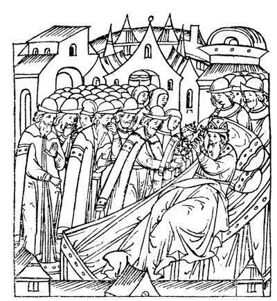 Рис. 1.17. У постели умирающего Василия III. Ему подносят маленького Ивана IV. Миниатюра из Лицевого Летописного Свода. Государственный Исторический Музей. Прорисовка взята из [776], с. 7.