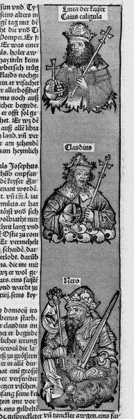 Рис. 1.16. Раскрашенная гравюра в старинной Хронике X. Шеделя, представляющая Калигулу, Клавдия и Нерона. Первые двое изображены как христианские цари. Согласно нашим результатам, все трое отражения одного и того же императора, а именно, Ивана Грозного. Взято из [1396:1], лист CIII.