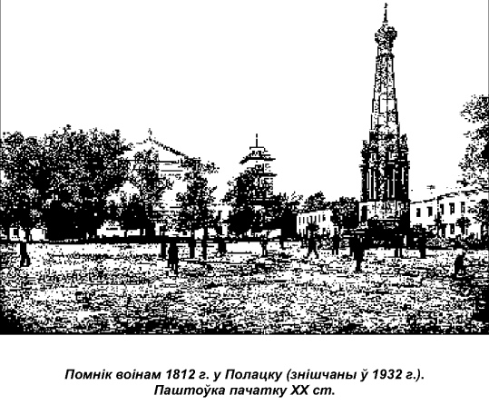 7 верасня 1850 года, у гадавіну Барадзінскай бітвы, на корпусным пляцы быў адкрыты 25-метровы манумент перамогі расійскай зброі ў Полацку. На ўрачыстасці прысутнічаў спадкаемец трона будучы імператар Аляксандр II, які праз трыццаць гадоў загіне на набярэжнай Кацярынінскага канала ў Пецярбургу ад бомбы беларуса-нарадавольца Ігната Грынявіцкага.