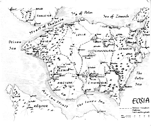Travelling with a suitable escort of one hundred Church Knights and various functionaries, Queen Ehlana took ship and sailed to the port of Salesha in eastern Zemoch. From there the royal party travelled north to Basne where an additional escort of horsemen from eastern Pelosia awaited them. Thus reinforced, the Elenes crossed the border into Astel in western Daresia. The accounts we have received of the queens journey have shown some glaring inconsistencies. Objections have been raised that, should we accept the word of these Elenes, we would clearly be faced with an absurdity. After some consideration, however, this writer has become convinced that these apparent discrepancies can be easily reconciled if those who so violently object will but take the trouble to examine the differences between the Elene and the Tamul calendars. The Queen of Elenia did not, in fact, pretend to have flown across the continent, as some have scornfully suggested. Her progress was quite normal, and it will be recognized as such if the learned gentlemen will but take note of the fact that the Elene week is longer than ours.