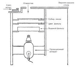 Установка для опытов была смонтирована на двух столах. На одном из них были установлены приборы для экспериментатора, за другой стол усаживался испытуемый. В крышке этого последнего было вырезано круглое отверстие диаметром около 4 см, приходившееся против ладони лежавшей на столе руки испытуемого; на соответствующем расстоянии от отверстия помещался затопленный в крышку обычный реактивный ключ, приспособленный для подачи электрокожного раздражителя. Под крышкой этого стола помещались: вертикально установленный проекционный аппарат, лучи которого собирались, затем несколько выше водяной фильтр, далее цветной фильтр и, наконец, дополнительная линза, собиравшая лучи так, что они точно покрывали собой площадь, образуемую вырезом в верхней крышке стола. Источником света служила лампа накаливания. Электрическое раздражение давалось при помощи индукционного аппарата Дюбуа-Реймона. Включение экспериментатором света и снятие руки испытуемого с ключа отмечались электрическим «втягивающим» отметчиком, работающим совершенно бесшумно. Испытуемый был отделен от экспериментатора экраном. Во время опытов лаборатория несколько затемнялась (см. схему установки на рис. 1).