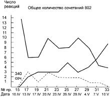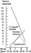 У третьего испытуемого, Гур., мы получили наиболее устойчивые результаты, что позволило поставить с ним значительное число контрольных опытов, описанных ниже. Уже на 9-м опыте у него было 6 правильных снятий, 2 пропущенных раздражителя и 1 ошибочное снятие. В дальнейшем он давал в среднем 56 правильных снятий, 23 раздражителя пропускал, количество ошибок колебалось от нуля до 12 (см. рис. 4).