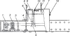 Рис. 5. Разрез установки для испытуемого: 1 лампа осветительная; 2 водяной фильтр; 3 цветной фильтр; 4 дополнительная линза; 5 отражающая призма; 6 дополнительный водяной фильтр; 7 стеклянная перегородка; 8 сигнальная лампочка; 9 ключ испытуемого; 10 электрод; 11 термометр; 12 сигнализатор ассистента