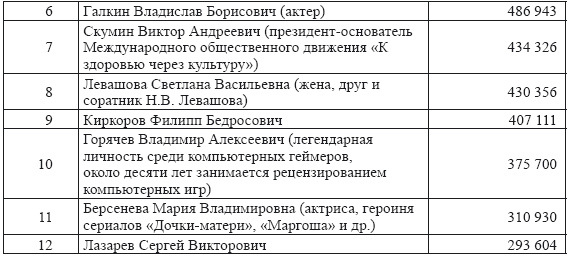 9. Левашов Николай Викторович (исследователь проблем мироздания, автор книг «Зеркало моей души», «Неоднородная вселенная», «Последнее обращение к человечеству», «Россия в кривых зеркалах» и др.) 555 312
