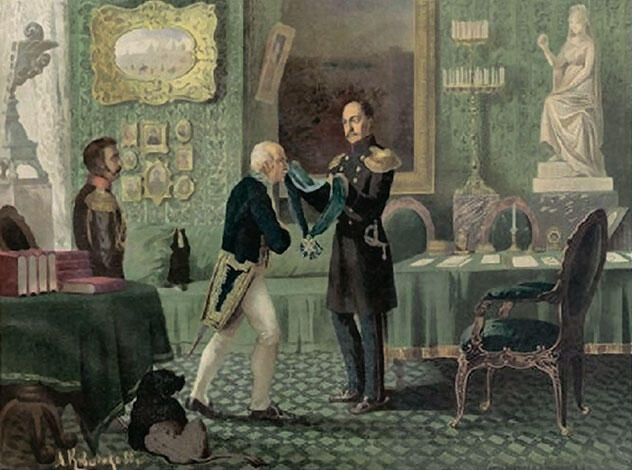 Император Николай I награждает Сперанского за составление свода законов. Худ. А. Кившенко. Начало XIX в.