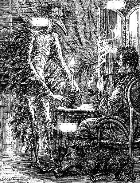 Пры святле Скамароха ўбачыў дзіўнае стварэнне: чалавек на танюсенькіх нагах, худы, вочы круглыя, дробным і вострым тварам падобны да птушкі.