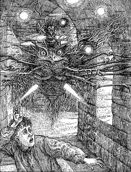 Ранкам, збіраючыся адусюль, манахі апавядалі адзін аднаму пра тыя начныя жахі. Езуіт-брамнік казаў, што гэтае начы ён чуў на калідоры нейкі дзіўны лёскат, а пасля нібы енкі і падземныя стогны. Калі ён выйшаў з келлі, убачыў жахлівыя дзівы: нейкая пачвара сунулася па калідоры, быццам човен па вадзе, і мноства лапаў з аднаго і з другога боку падымаліся і апускаліся, нібы вёслы.