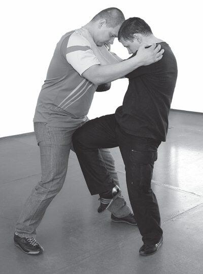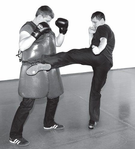 удар вперед сзади стоящей ногой (подушечками пальцев стопы или пяткой) (рис. 61);