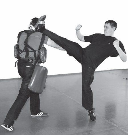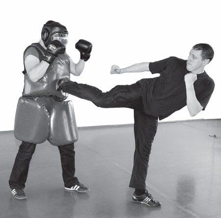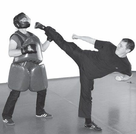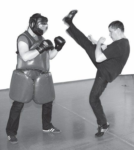 Рис. 67 а, б. Удар стопой в сторону ребром и подошвой