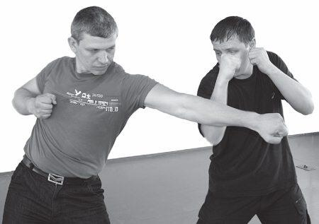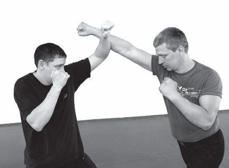 Руки расположены перед грудью, прикрывая голову. Отбивая атаку в корпус или голову, отвести предплечье противника в сторону своим предплечьем или тыльной стороной ладони изнутри-наружу. В момент соприкосновения локоть согнут под углом 90 градусов, кисть расположена на уровне подбородка (рис. 91).
