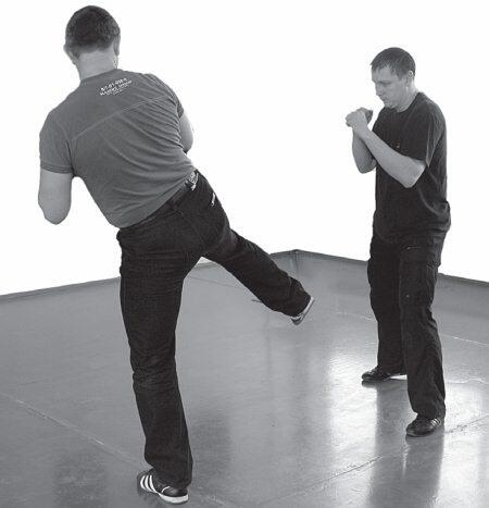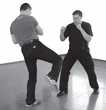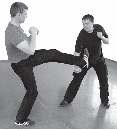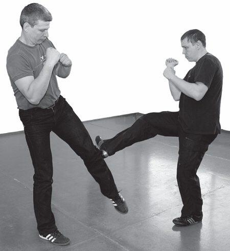 Атакующий начинает выполнять удар ногой вперед. Действуя на опережение, наносим стопорящий удар стопой в область коленного сустава бьющей ноги противника (рис. 95).