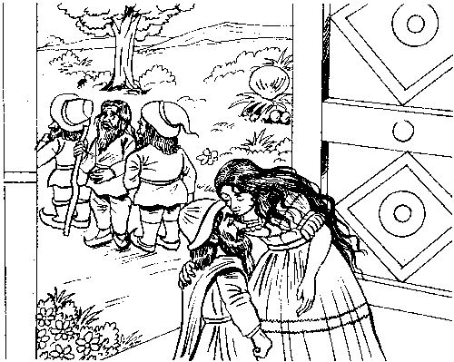 She kissed each dwarf on the forehead and bid him goodbye. Bashful was standing in a corner. He liked it when Snow White kissed him, but he felt very shy. She pulled him out of the corner and planted a kiss on his forehead, too. Grumpy was trying to go out very quickly, so that she would not see him scowling as he went.