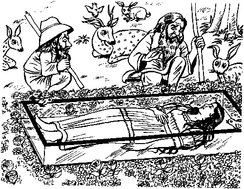 So they placed her in a glass coffin, put many flowers around her and carried the coffin into the forest. They put it under a large tree and kept watch over it by turns, day and night.