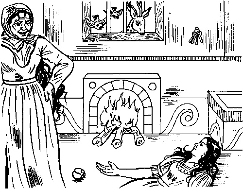 Snow Whites forest friends had been anxiously watching. They did not like the old woman. Was she really a pedlar woman or was she the wicked Queen, they wondered. The birds chirped loudly and fluttered at her face, but she beat them away.