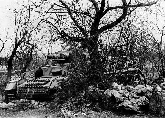Немецкий танк Pz.IV Ausf.F1 в засаде на боевой позиции. Танк имеет бело-серый камуфляж. Группа армий «Юг», апрель-май 1942 года (БД).