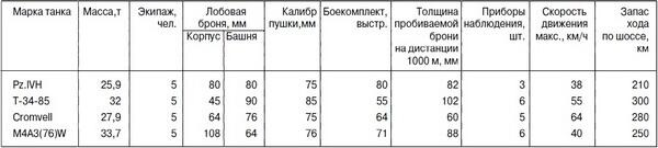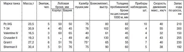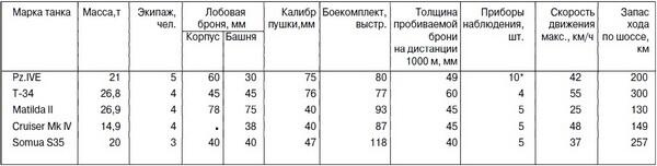 Как видно из таблицы 1, в 19401941 годах в Европе было только два полноценных средних танка T-34 и Pz.IV. Британская «Матильда» превосходила немецкий и советский танк в броневой защите в той же степени, в которой Mk IV им уступал. Французский S35 представлял собой доведенный до совершенства танк, соответствовавший требованиям Первой мировой войны. Что же касается Т-34, то, уступая немецкой машине по ряду немаловажных позиций (разделение функций членов экипажа, количество и качество приборов наблюдения), он имел равноценное с Pz.IV бронирование, несколько лучшую подвижность и значительно более мощное вооружение. Такое отставание немецкой машины легко объяснимо Pz.IV задумывался и создавался как штурмовой танк, предназначенный для борьбы с огневыми точками противника, но не с его танками. В этом плане Т-34 был более универсальным и, как следствие, по заявленным характеристикам лучшим на 1941 год в мире средним танком. Спустя всего полгода ситуация изменилась, о чем можно судить по характеристикам танков периода 19421943 годов.