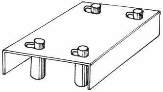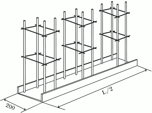 Фундамент ворот углубляют на 1 м или более, но главное не выше уровня промерзания грунта (лучше на 20 см ниже), расположив его вдоль забора в сторону открывания полотна. Для этого понадобится выкопать прямоугольную яму шириной 300400 мм, глубиной 1 м и длиной, равной половине размера проема. Далее приступают к изготовлению металлического каркаса фундамента (рис. 49), для чего потребуется металлический швеллер 20 шириной от 160 до 200 мм и длиной, равной длине ямы. Затем к нему приваривают 910 ножек из арматуры диаметром 12 мм, скрепив их дополнительно связями из отрезков арматуры.