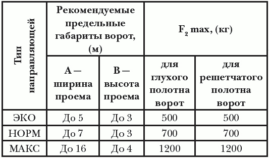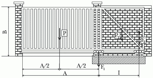 Формула расчета конструкции ворот: F1 = F2 + P + Pт; F2 = (P × A / I Pт) / 2. Чтобы грамотно сделать расчет, необходимо установить величину F2, потому что наибольшее значение силы, которая воздействует на роликовую опору, у каждой из направляющих ограничено. Габариты ворот указаны в таблице.