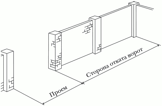 На представленном рисунке дан участок стены для ворот с правой стороной отката. Так как ворота задвигаются по стене изнутри ограды, нужно обеспечить условия для беспрепятственного движения полотна. Также следует учесть естественный уклон, а при наличии такового имеющиеся в рабочей зоне деревья, возможные искривления забора и т. п. Длина зоны для отката должна быть, как минимум, в 1,5 раза больше ширины проема, которая обычно равна 4 м.