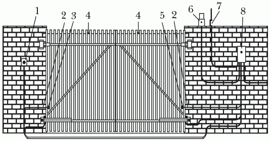 Рисунок 54. Схема распашных ворот (после монтажа): 1 кнопка управления; 2 редукторный электропривод; 3 фотоэлемент (передающий); 4 створка ворот; 5 фотоэлемент (приемный); 5 сигнальная лампа; 7 приемная антенна; 8 блок управления с приемником радиосигнала