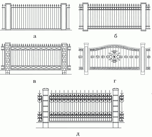 Рисунок 62. Разновидности кованых ограждений: а классическое ограждение с пиками; б ограждение с пиками и кольцами; в ограждение с пиками; г ограждение с декоративными коваными элементами; д ограждение с завитками и кольцами