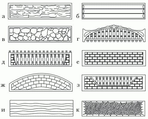 Рисунок 16. Внешний вид панелей: а сланец; б сруб бревенчатый; в бут; г, д декоративный вверх; е, ж, з кирпич; и доска внахлест; к щебень