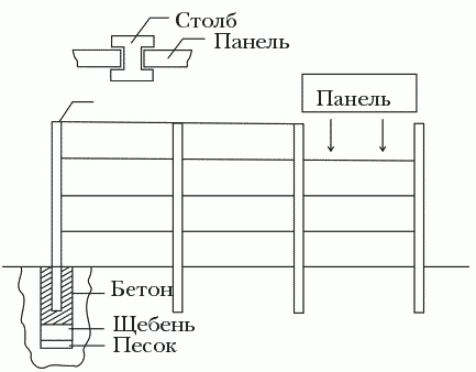 Устанавливают первый столб, выставляя его по вертикальному и горизонтальному уровню, и заливают бетоном. Затем готовят яму под следующий столб. В паз первого столба вставляют панели. Затем в яму устанавливают второй столб, который как бы натягивают на панели. Выравнивают ее по вертикали и горизонтали. Бетонируют второй столб. Затем точно так же монтируют следующую секцию (рис. 18).