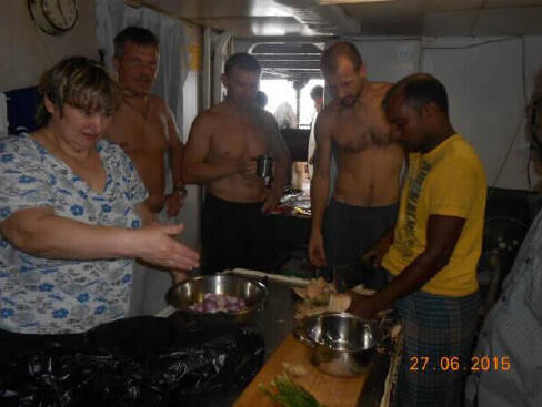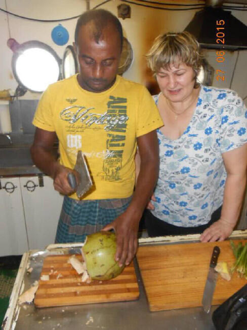 В местной команде был настоящий повар, который ловко готовил для своих различные блюда. Побережье считается сплошь мусульманским, то есть они соблюдают свои обычаи, один из которых не до вечера. Как только стемнело, все собираются к столу. Много очень интересных блюд, даже фрукты в исполнении этого повара выглядят странно. Русский повар для них, как божество, каждый хочет с ней сфотографироваться. Очень быстро нашли общий язык. Тут для российского экипажа все было просто: судно пригнали, теперь осталось только покинуть его благополучно. Местные сторожа уже провели ревизию, некоторые вещи исчезли в их бездонных мешках. Сами они боятся чужаков, не дают возможности подойти к борту не замечено. Сразу поднимают тревогу! «Али баба! Али баба!»