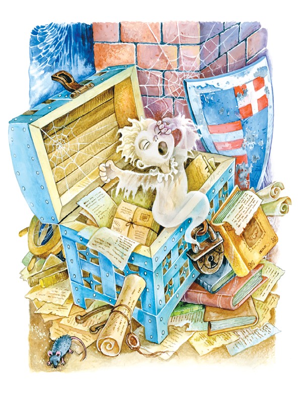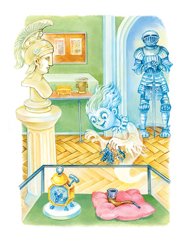 Маленькое Привидение качнуло связкой ключей, открыло витрину и взяло часы. Оно завело будильник и, довольное, поспешило к себе на чердак. Там оно влезло в сундук и поставило стрелку на девять часов утра.