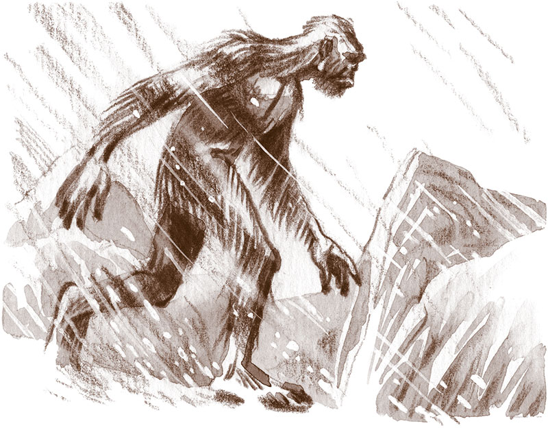Путешественник протер глаза. Уж не привиделось ли ему это? Однако странное существо не исчезало. Слегка сгорбившись, оно проворно шло вниз по склону. На момент скрылось за обломком скалы, потом снова показалось на тропинке.