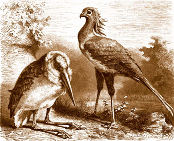 Секретарь (S. secretarius) отличается от прочих хищных птиц своими необыкновенно длинными плюснами, так что ноги его напоминают ноги журавлей. 〈…〉 На голове замечается хохол, состоящий из 6 длинных перьев, могущих приподниматься. 〈…〉Секретарь питается главным образом пресмыкающимися и амфибиями, но не пренебрегает при случае и другими позвоночными; он не оставляет также без внимания насекомых… 〈…〉 Как искусный истребитель змей, секретарь известен уже издавна; в борьбе с ними он распускает одно крыло и действует им как щитом. 〈…〉 Остается сказать несколько слов о самом имени секретаря, которое может показаться несколько странным. Однако происхождение его вполне понятно, если сравнить эту птицу с писарем, заложившим за ухо перо. (А. Брэм. Жизнь животных, т. 2)