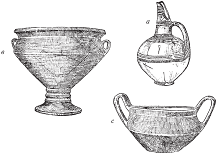 Рис. 2. Среднеэлладская керамика: а – матовый раскрашенный сосуд из Микен; в, с – миньянские изделия из Кораку (по Уэйсу и Штуббингу)