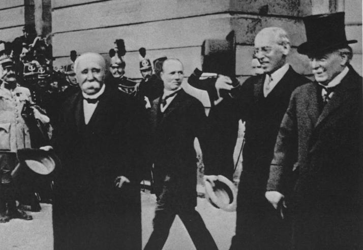 Подписавшиеся стороны Версальского мира. Ж. Клемансо, В. Вильсон, Д. Ллойд Джорж. Париж, 1919 год