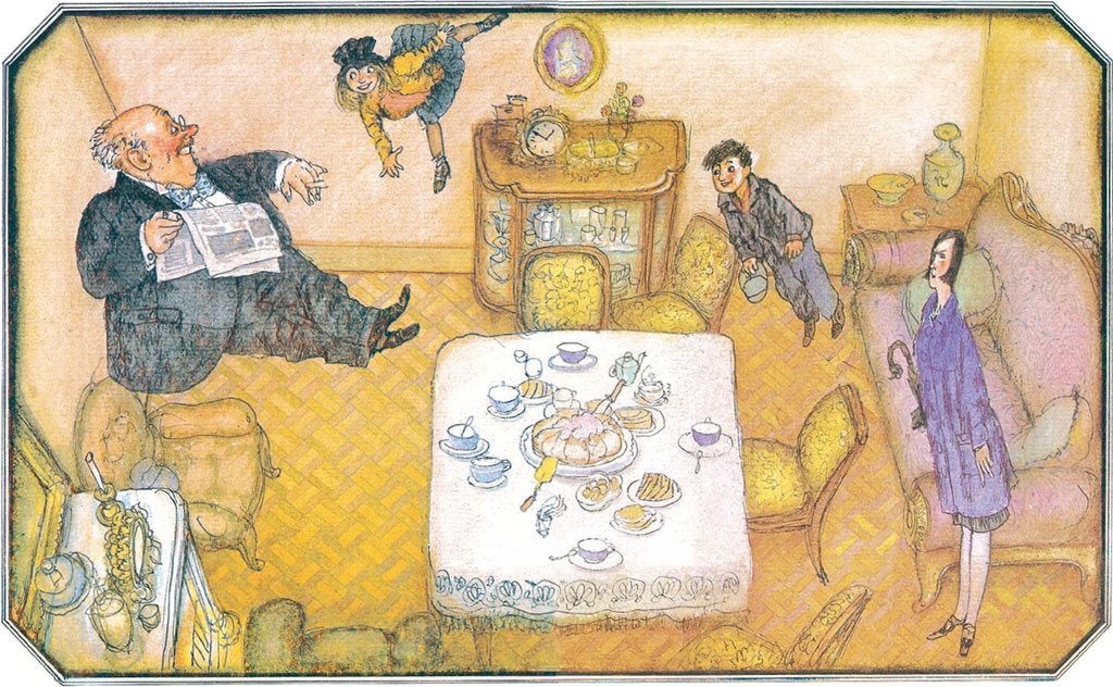 Джейн и Майкл и по сей день не находят объяснения тому, что произошло дальше. Одно несомненно: только мистер Кудри проговорил последние слова, как внизу стол зашевелился, опасно накренился и, звеня чашками, подбрасывая пирожные на тарелках, поплыл вверх и, описав плавный круг, завис в воздухе перед мистером Кудри.