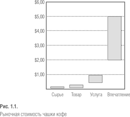 Давайте возьмем в качестве примера настоящий сырьевой товар: кофе. Компании, которые собирают кофейные зерна или торгуют ими на фьючерсном рынке, получают (на момент написания этой книги) немногим более 1,65 долл. за килограмм, т. е. 1 или 2 цента за чашку. Когда производитель обжаривает, перемалывает, упаковывает и продает те же самые кофейные зерна в бакалейной лавке, превращая их таким образом в товар, для потребителя цена возрастает до 5–25 центов за чашку (в зависимости от торговой марки и размера упаковки). Если же сварить кофе в самом обычном, ничем не примечательном придорожном кафе, ресторане быстрого обслуживания или баре, эта услуга будет стоить уже от 50 центов до 1 долл. за чашку.