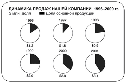 «Ой, я что-то пропустил? Могу поклясться – я слышал, как Фрэнк говорил, что продажи значительно выросли, но вижу лишь несколько круговых диаграмм, показывающих увеличение доли нашей основной продукции. А, понял! Он имеет в виду цифры под каждой из диаграмм…»