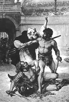 Со времени правления Константина Великого (285–337), первого римского императора, принявшего христианство, популярность гладиаторских игр начала снижаться. Со стороны наиболее образованной части римского общества все чаще раздавались протесты, касавшиеся, впрочем, не самих поединков, а лишь их извращенной жестокости. В 325 году эдиктом Константина кровавые игрища были запрещены во всех провинциях Империи, кроме Умбрии и Этрурии. Такое послабление послужило примером другим районам, поэтому отдельные состязания проводились в порядке исключения еще более 30 лет.