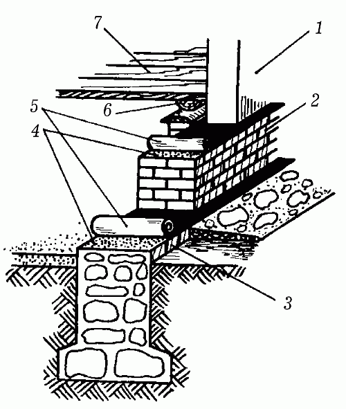 Рис. 33. Ленточный фундамент: 1 – стена; 2 – цоколь; 3 – отмостка; 4 – раствор цемента; 5 – гидроизоляционный материал; 6 – лага; 7 – пол