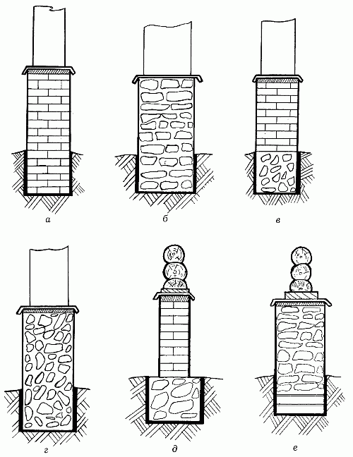 Рис. 32. Фундаменты, сделанные из различных материалов: а – кирпичный; б – бутовый; в – кирпичный с бутобетоном; г – бутобетонный; д – кирпичный с бутом; е – бутовый на песчаной подушке
