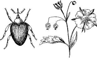 Рис. 14. Колорадский жук (взрослый жук, яйцекладка, личинки)