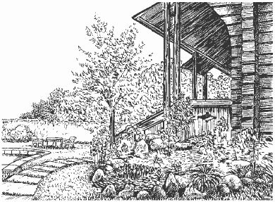 У дома, с южной стороны, рекомендуется устроить патио с летней столовой. Со стороны одной из дорог оно должно быть дополнительно закрыто перголой с вьющимися растениями. Это могут быть виноград, жимолость, розы или однолетники – такие, как ипомея, душистый горошек, обыкновенная фасоль. Вместо патио можно соорудить широкую террасу с навесом, а вокруг дома и площадки для отдыха разбить сад и небольшой огород.