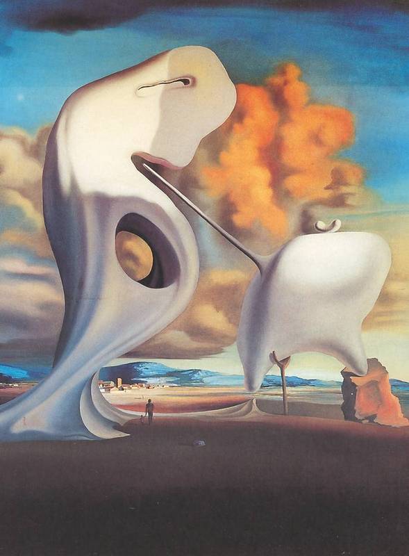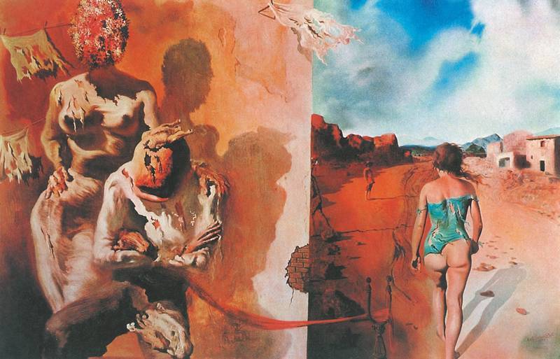 Трагической силы достигает мастерство Дали в композиции «Мягкая конструкция с вареными бобами: предчувствие гражданской войны». На фоне грозового угрожающего неба мастер изображает чудовищное сцепление частей тела человека: в агонии руки стискивают обрубок плечевой кости, которая диагональю перерезает полотно. Горизонт находится совсем низко – это только узкая полоска земли, по которой раскиданы бобы, части внутренностей и окровавленные кусочки кожи. В композиции очень выразительно показана фактура, контрасты цветовых соотношений и сложность линейной композиции. Эта картина стала почти пророческой, поскольку буквально через полгода в Испании разразилась гражданская война, и тело страны было разорвано в клочья.