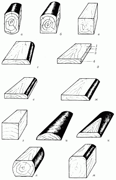 Рис. 9. Виды пиломатериалов: а – двухкантный брус; б – трехкантный брус; в – четырехкантный брус; г – доска необрезная; д – доска чистообрезная: 1 – пласть; 2 – кромка; 3 – ребро; 4 – торец; е – обрезная доска с тупым обзолом; ж – обрезная доска с острым обзолом; з – брусок; и – обапол горбыльный; к – обапол дощатый; л – шпала необрезная; м – шпала обрезная.