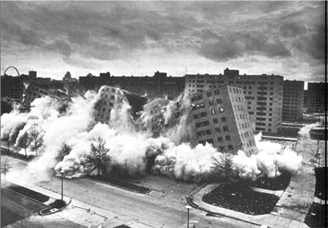 На первый взгляд трудно понять, как можно было стереть с лица земли целые кварталы прочных многоэтажных домов. Однако за этим жестом отчаяния городских властей и в США, и во Франции стояла базисная ошибка инвестора на пару с архитектором. Тип застройки, относительно пригодный для скромного в средствах, но работающего и вполне самостоятельного состава семей, был применен для заселения безработными, живущими на социальное пособие и не способными содержать инфраструктуру дома.