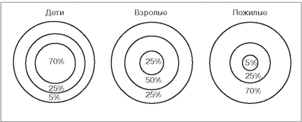 В ряде случаев наличие «просто» реинкарнационного менталитета могло бы способствовать суициду как способу бегства в иную, более правильную и справедливую жизнь.[3] Однако необходимость моральной жизни, когда «деятельность души в этом мире определяет ее положение в мире грядущем» (См.: Гроф, Галифакс, 1995), служит существенным сдерживающим сознательную аутоагрессию фактором. Действительно, комфортное (райское) бессмертие является условием надлежащего выполнения морального императива «разумно вести себя таким образом, как будто нас безусловно ожидает иная жизнь и при вступлении в нее будет учтено моральное состояние, в соответствии с которым мы закончим нынешнюю» (Кант, 1980). Поэтому одним из основополагающих нравственных установлений явилось приравнивание самоубийства к греху, сравнение суицида с убийством существа, принадлежащего Богу. «Бог создал жизнь и лишь один он может взять ее» (Блаженный Августин. «Город Божий». Цит. по: Hillman, 1993). Можно предположить, что в различные возрастные периоды значимость систем выживания будет неодинаковой. На рисунке 2 мы попытались графически отобразить их соотношение у гипотетического человека в детстве, зрелом возрасте и старости.