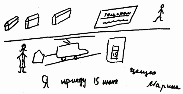 Каждый больной самостоятельно составлял «текст» телеграммы. Затем всей группе предлагалась зашифрованная рисунками телеграмма, нужно было распознать смысл рисунка-телеграммы, передать содержание словами. Иллюстрируем сказанное примерами: