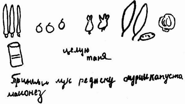 Общими усилиями текст телеграммы представлен следующим образом: «Пришлите мне лук, редиску, огурцы, капусту». Узнавание рисунков этой телеграммы затруднено из-за их нечеткости, что вызвало споры в группе, совместное обсуждение, т.е. коллективную деятельность по расшифровке содержания телеграммы.