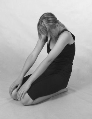 Голова должна упираться в пол затылком. При этом нужно постараться расслабить шею. Подбородок не должен соприкасаться с горлом. Следует также закрыть глаза и расслабить нижнюю челюсть.